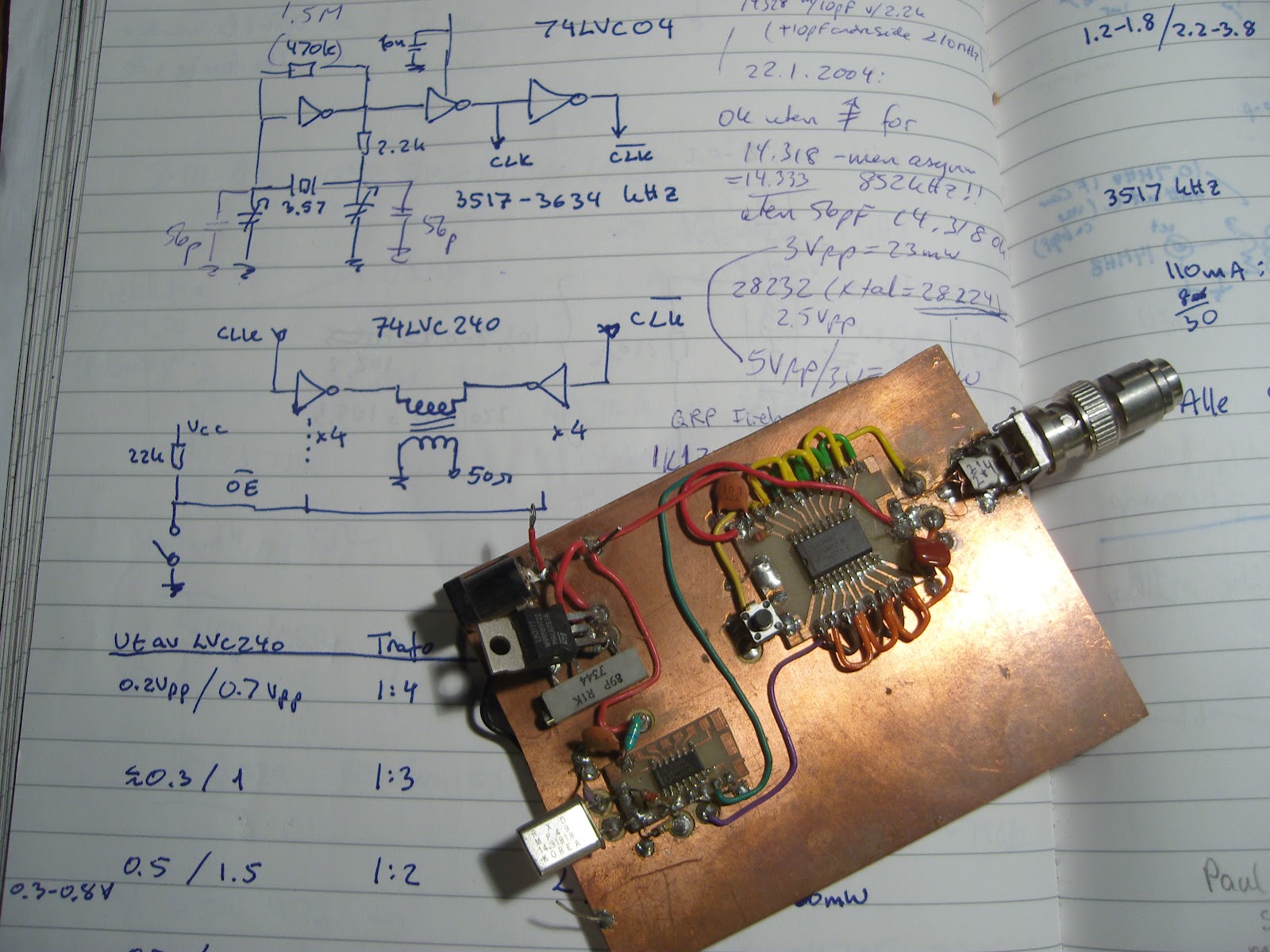 | My low voltage transmitter: 74LVC240 output stage (to the right), oscillator with 74LVC04 (lower left), LM317-based variable power supply (upper left) |